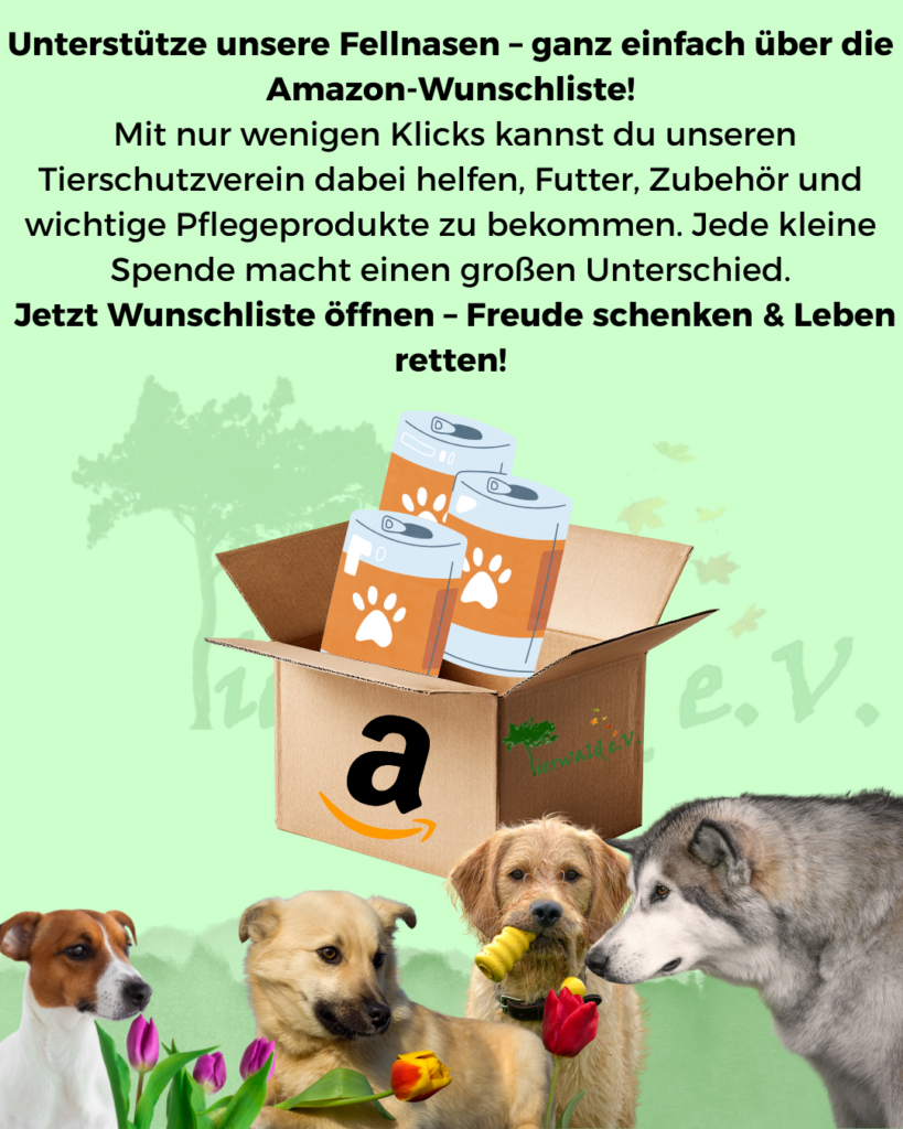 Unsere Schützlinge warten sehnsüchtig auf ihre nächsten Mahlzeiten und notwendigen Hilfsmittel. Mit nur einem Klick auf unsere Amazon-Wunschliste kannst du direkt sehen, was wir am dringendsten brauchen. Keine Spende ist zu klein – deine Hilfe kommt direkt an!
